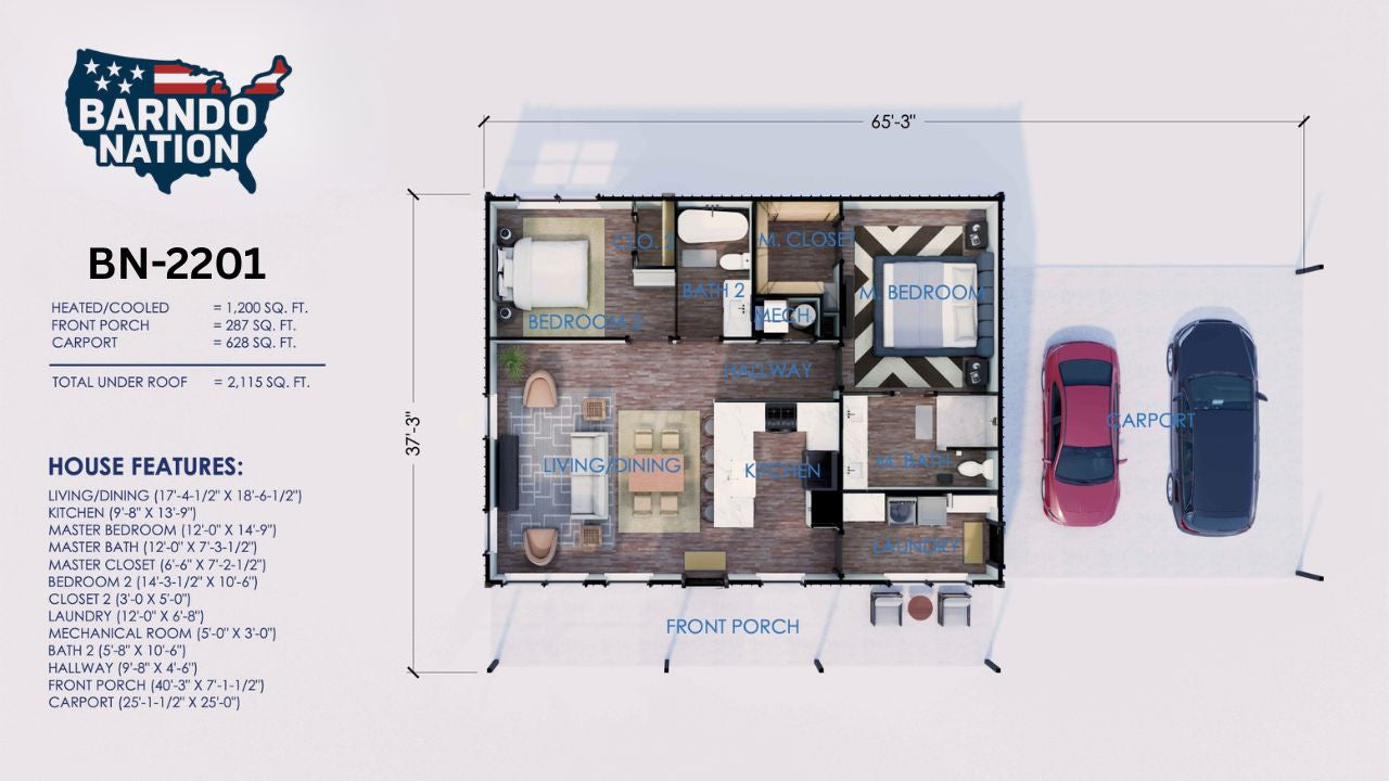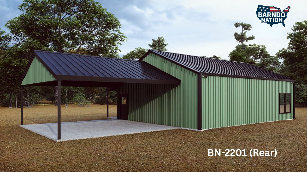 Plan BN-2201 is a well-designed 2-bedroom, 2-bath barndominium floor plan offering 1,200 square feet of efficient living space, a full-length front porch, and a 2-car carport.