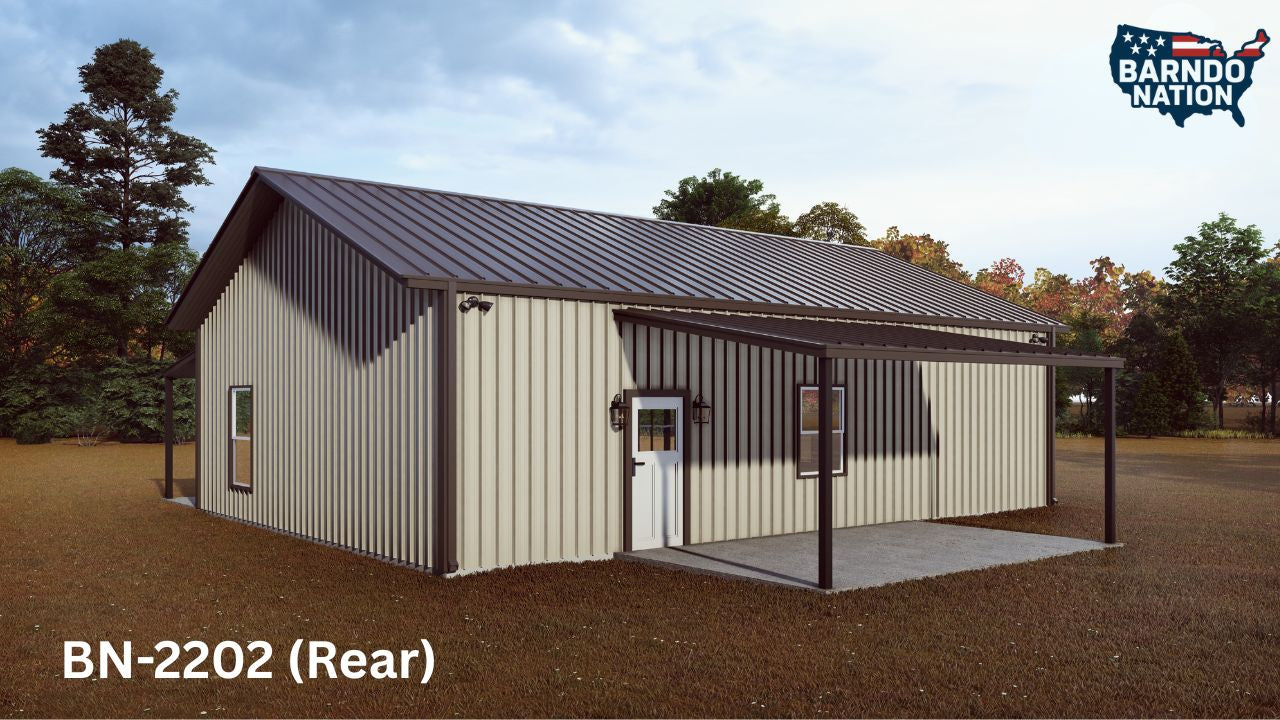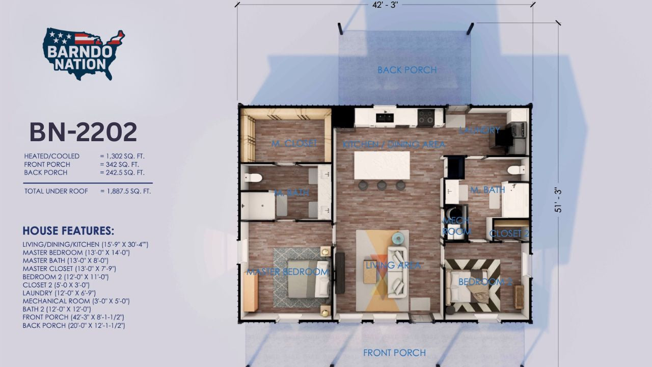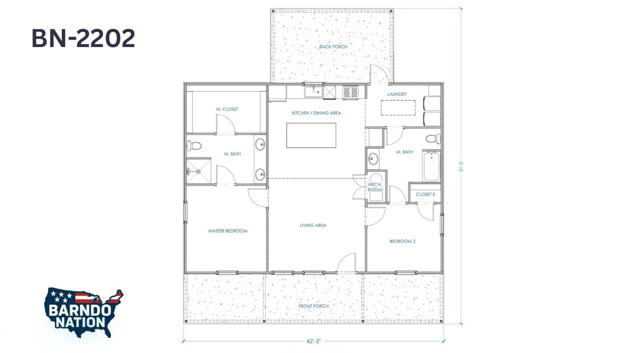 Plan BN-2202 is an open-concept 2-bedroom, 2-bath barndominium floor plan offering 1,300 square feet of efficient living space and a full-length front porch