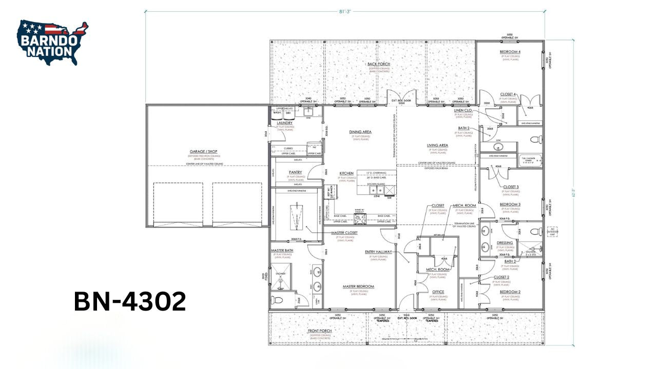 Plan BN-4302 is ideal for families needing additional space, home office functionality, and generous outdoor living. This stock floor plan works well for rural properties, full-time residences, or anyone looking to combine classic barndominium style with modern convenience and efficient design.