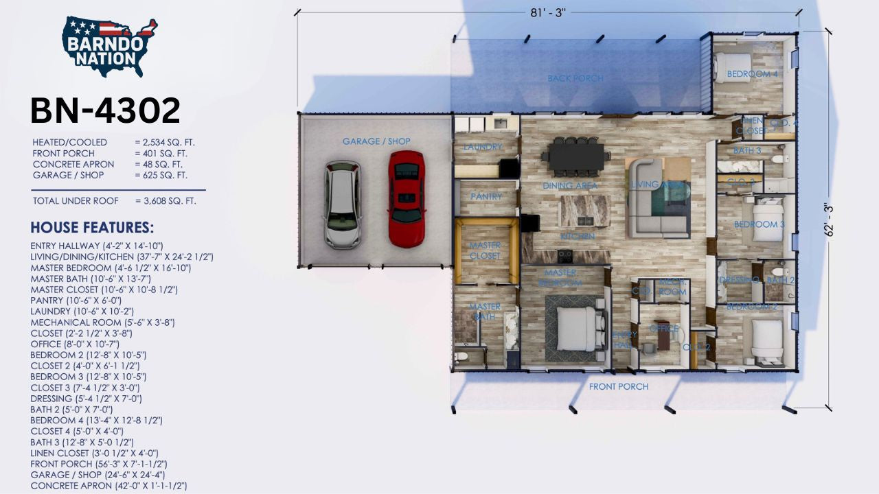 Plan BN-4302 is a single-story barndominium floor plan featuring 4 bedrooms, 3 bathrooms, and 2,534 square feet of living space.